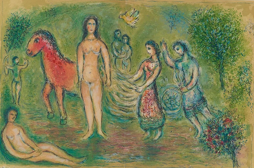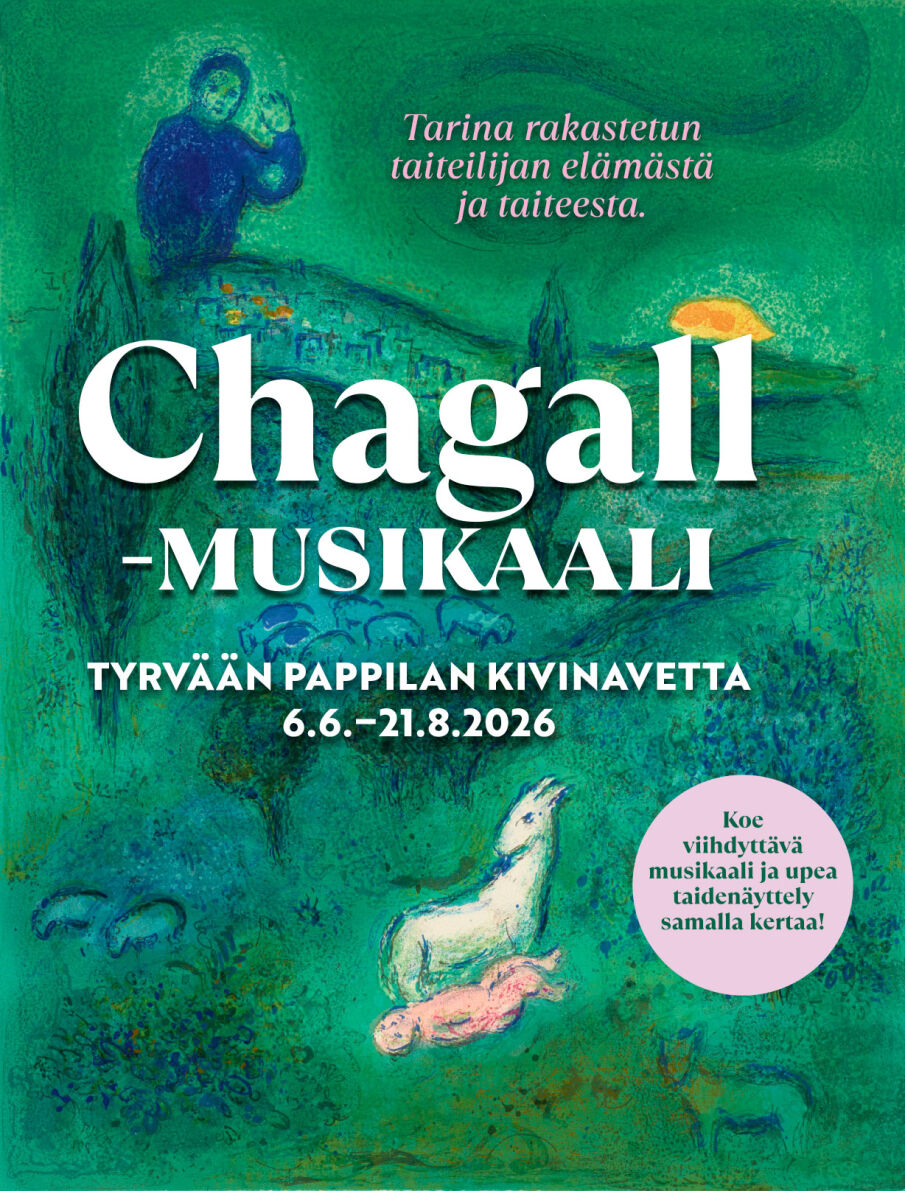 ” Musikaalissa taiteilija Marc Chagallin mielenmaisemat, muistot ja rakkaudet kietoutuvat antiikin kreikkalaiseen tarinaan Dafnis ja Khloe. Vieraillessaan Kreikassa Chagall ihastui tarinaan ja kuvitti sen vuonna 1961. Sarjan kaikki 42 värikylläistä teosta ovat nähtävillä taidenäyttelyssä.” Lainaus Tyrvään Pappilan sivuilta.
