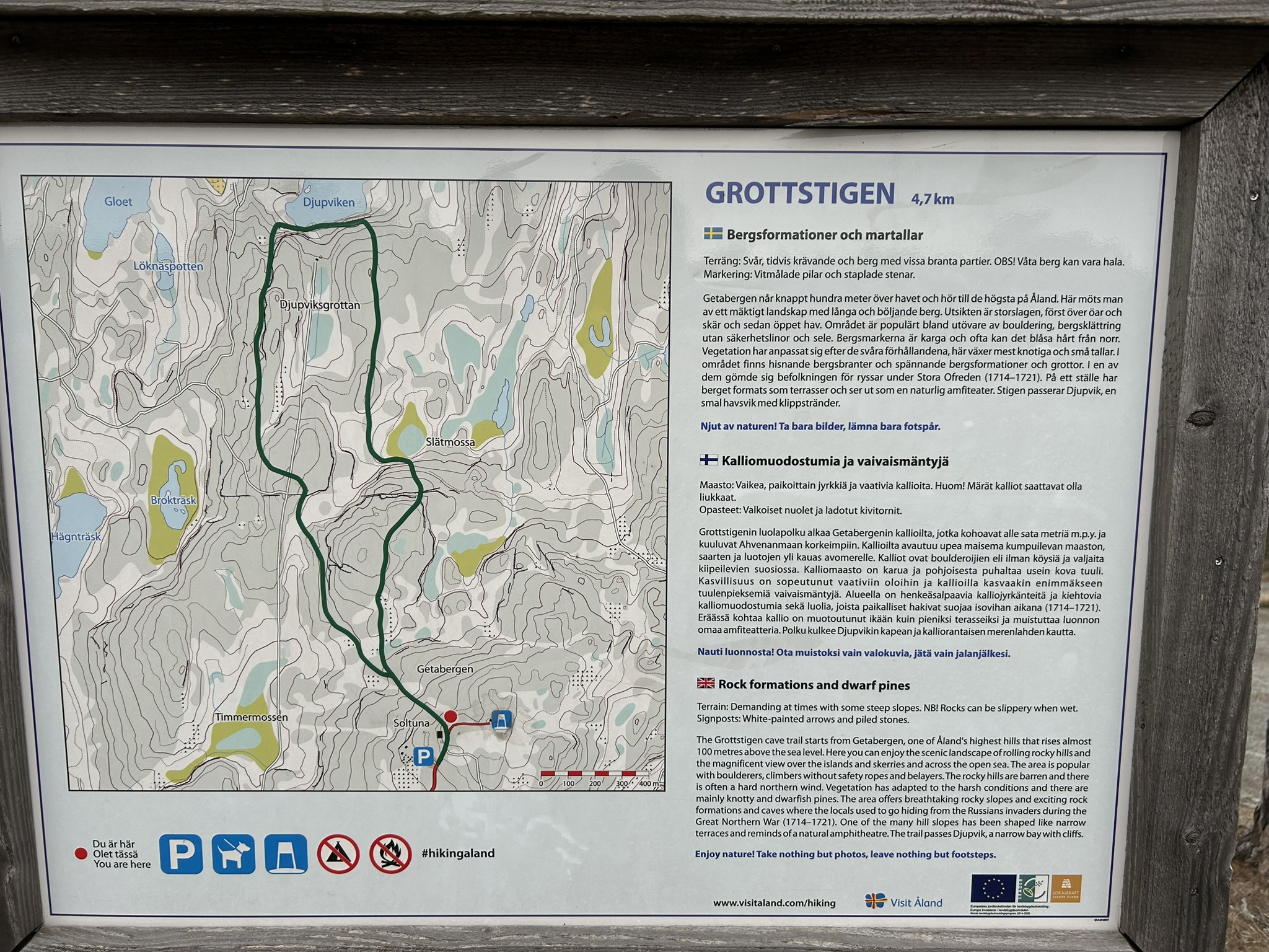 Grottstigenin luolapolku alkaa Getabergenin kallioilta, jotka kohoavat alle sata metriä m.p.y. ja kuuluvat Ahvenanmaan korkeimpiin. Kallioilta avautuu upea maisema kumpuilevan maaston, saarten ja luotojen yli kauas avomerelle. Kalliot ovat boulderoijien eli ilman köysiä ja valjaita kiipeilevien suosiossa. Kalliomaasto on karua ja pohjoisesta puhaltaa usein kova tuuli. Kasvillisuus on sopeutunut vaativiin oloihin ja kallioilla kasvaakin enimmäkseen tuulenpieksemiä vaivaismäntyjä. Alueella on henkeäsalpaavia kalliojyrkänteitä ja kiehtovia kalliomuodostumia sekä luolia, joista paikalliset hakivat suojaa isovihan aikana (1714–1721). Eräässä kohtaa kallio on muotoutunut ikään kuin pieniksi terasseiksi ja muistuttaa luonnon omaa amfiteatteria. Polku kulkee Djupvikin kapean ja kalliorantaisen merenlahden kautta. Nauti luonnosta!